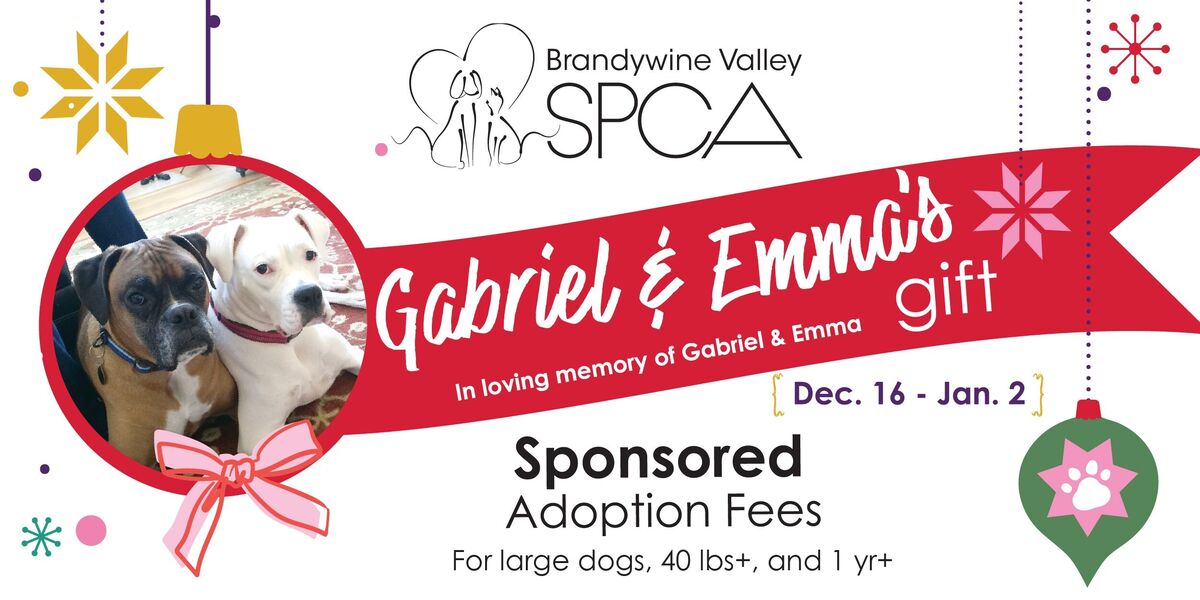We’re grateful to be able to make this holiday season brighter for the lovable canines in our care. Extending Gabriel and Emma’s legacy of love, adoption fees for all large adult dogs (1yo & 40lbs+) are sponsored through Friday, January 2, in their memory.