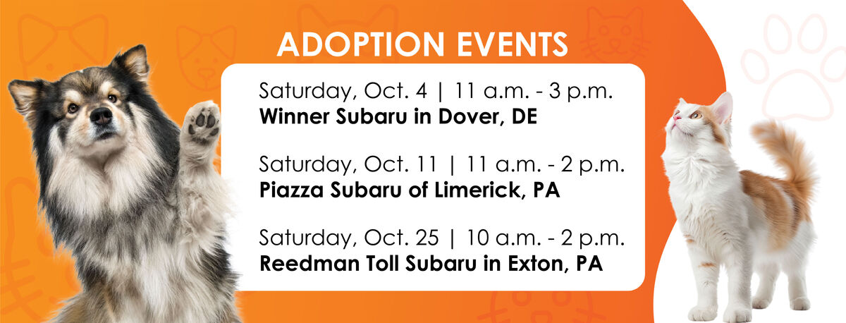 Join us Saturday, October 25, 10 a.m.- 1 p.m. at our New Castle Campus for a special Trunk-or-Treat adoption event! Delaware Subaru will be bringing the trunks and treats, and we’ll provide the pets! Bring the whole family, costumes are encouraged, get some treats, and welcome a new furry friend into your home.